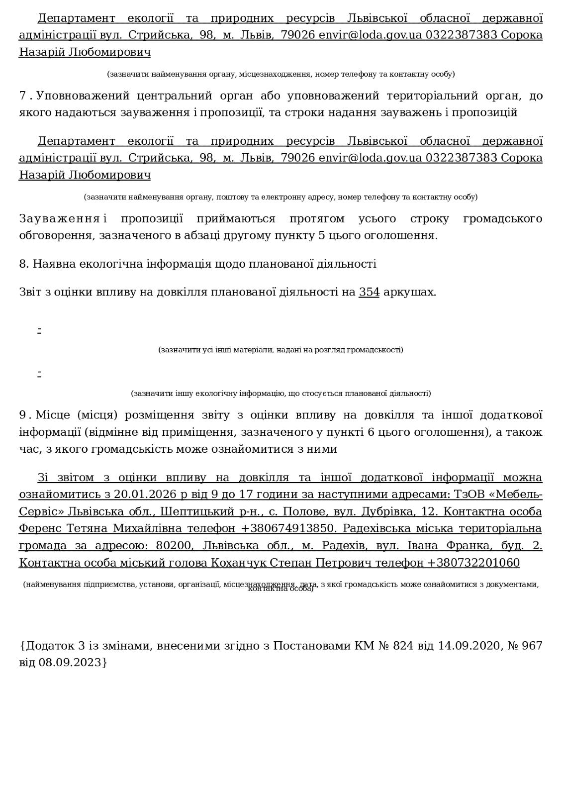 На виконання пункту 2 статті 4 Закону України «Про оцінку впливу на довкілля» направляємо оголошення про початок громадського обговорення звіту з оцінки впливу на довкілля планованої діяльності (далі – Звіт з ОВД) «Експлуатація (модернізація) АЗС ТзОВ «Мебель - Сервіс» призначеної для зберігання світлих нафтопродуктів та заправка паливом автотранспорту усіх типів за адресою: Львівська обл., Шептицький р-н, с. Полове, вул. Дубрівка, 12» суб’єкта господарювання ТОВ «МЕБЕЛЬ-СЕРВІС» (реєстраційний номер справи 14625)